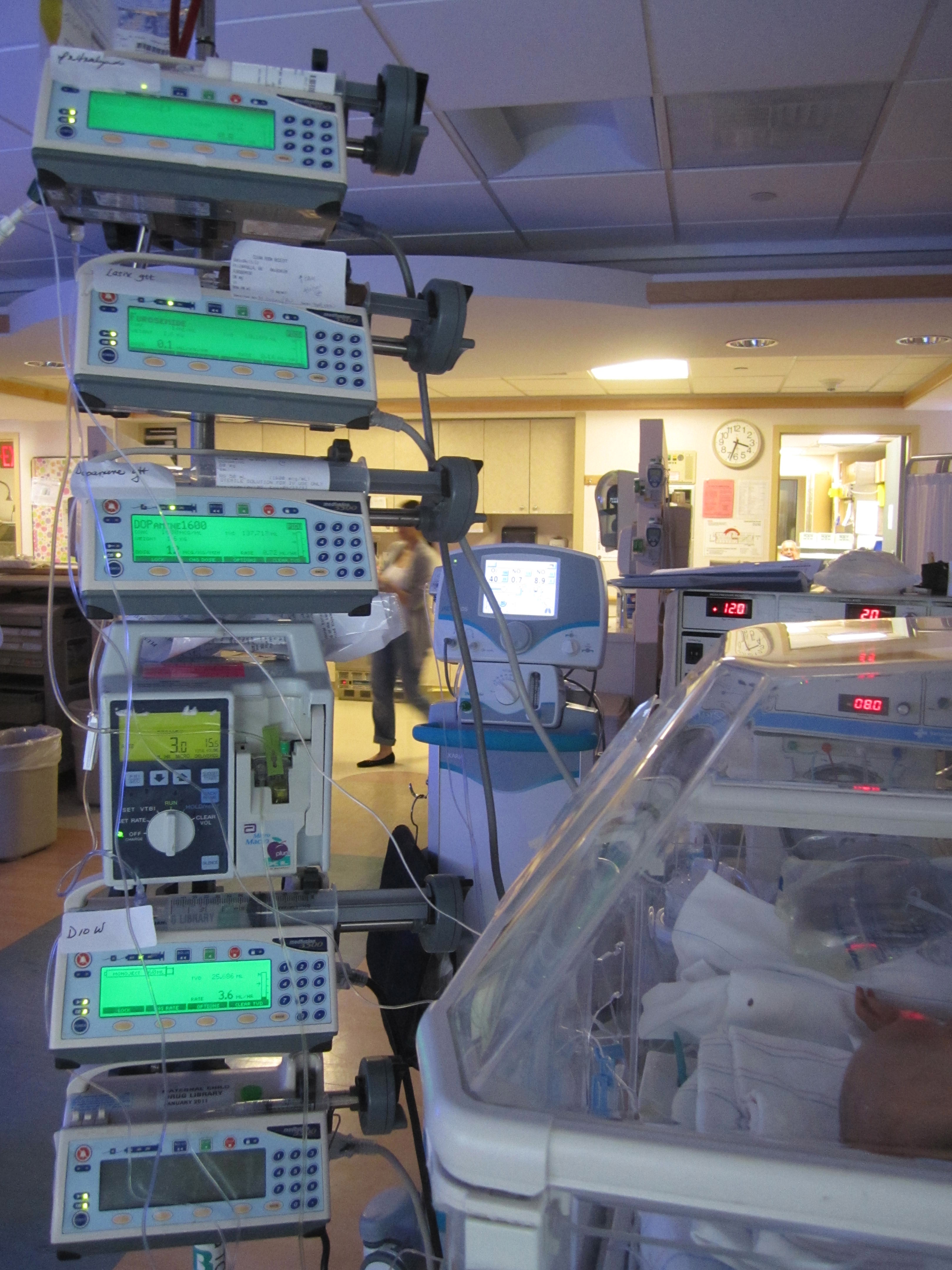 When we arrived at the hospital on Tuesday morning we saw Claudia, our nurse taking care of the baby next to Remy.  Relief!  The past few nights when she was really sick her night nurse, Lily, set up a mobile nurses station right next to Remy so she could watch her all night.  Currently, she doesn’t need to be watched 24/7.   They were even able to close the incubator cover (which has had to remain open since Friday for accessibility).  Her intubator was originally running at 100% and is now at 45%. She is currently getting 360 puffs of air per minute, opposed to 420 from the weekend.  Her nitric oxide was reduced.  Everything is heading in the right direction!