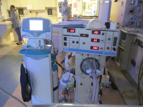At 4:00 pm Wednesday, Remy was being weaned off of the oscillator and the nitrous oxide machines.  She started at 100% oxygen and 20 ppm (parts per million) of Nitrous and then was 45 % oxygen and was down to 15ppm of Nitrous.