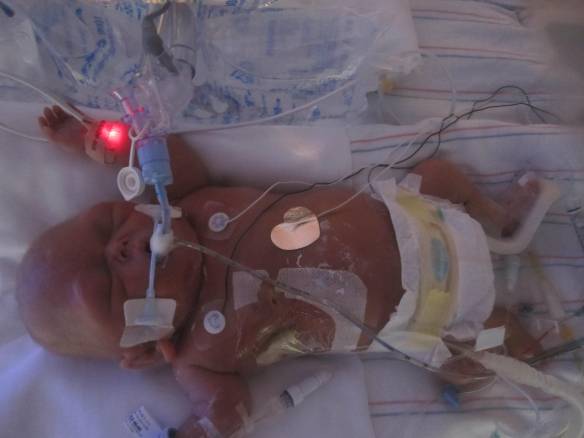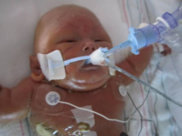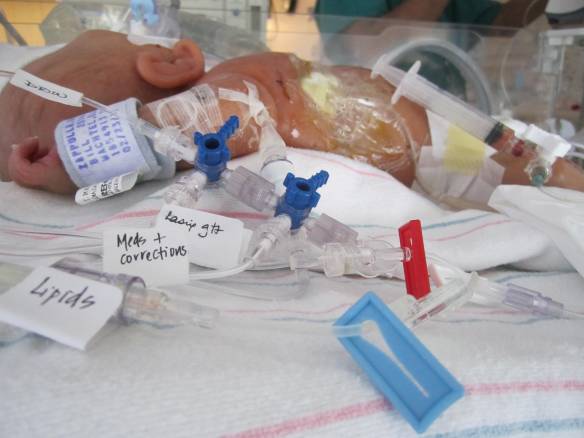 Here is a more clinical version of what Remy has been going through. She is now 33 days old but she is still unable to tolerate food.  Her only source of nourishment is through TPN drips into an I.V.  She receives potassium, electrolytes, calcium, and amino acids and has been administered Pepcid for acid reflux.  She’s on Lasix which can reduce the swelling and fluid retention and treat high blood pressure, but mainly it is to treat her kidneys, which were in danger of failing.   She is currently breathing through an intubator and the nitric oxide machine, on continuous doses of Phenobarb, and Keppra to control the seizures.   She is on four antibiotics; Vancomycin, Zosyn, Cefotax. and  Fluconazole, an antifungal antibiotic.  She was taken off the Fluconazole today, the rest are on a 10-day cycle.  She was put on Dopamine has been slowly weaned down and Epinephrine, which she was thankfully taken off the on Sunday.