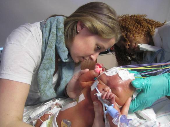 Still we cannot do an MRI because she is in no state to do so.  An MRI would give us more accurate idea of what may or may not be going on under that little skull of hers.  It’s a huge concern.  Could this be damaging her brain?  Could it be affecting her in the long term?  Yes.   On the other hand, it could be cranial reaction that has yet to do any damage.  Her motor functions work well.  She grabs, jerks and clenches, yawns, licks her lips and reacts dramatically at times and this is all positive.   We can feel her presence.  She has reactions like you and I.   Though we cannot hear anything because she is intubated she cries, yawns, gets pissed off.  You can tell when she is uncomfortable or hurting.